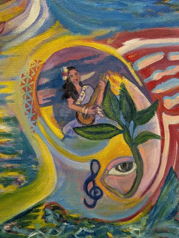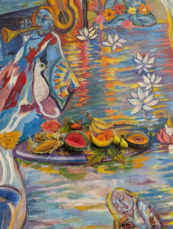 At 36 × 48 inches, this large-scale oil painting unfolds like a dream you somehow recognize — mythological figures, musicians, animals, deities, and human forms all coexisting in a flowing, almost liquid landscape. It feels like a gathering that has always been happening, somewhere just beyond the visible.