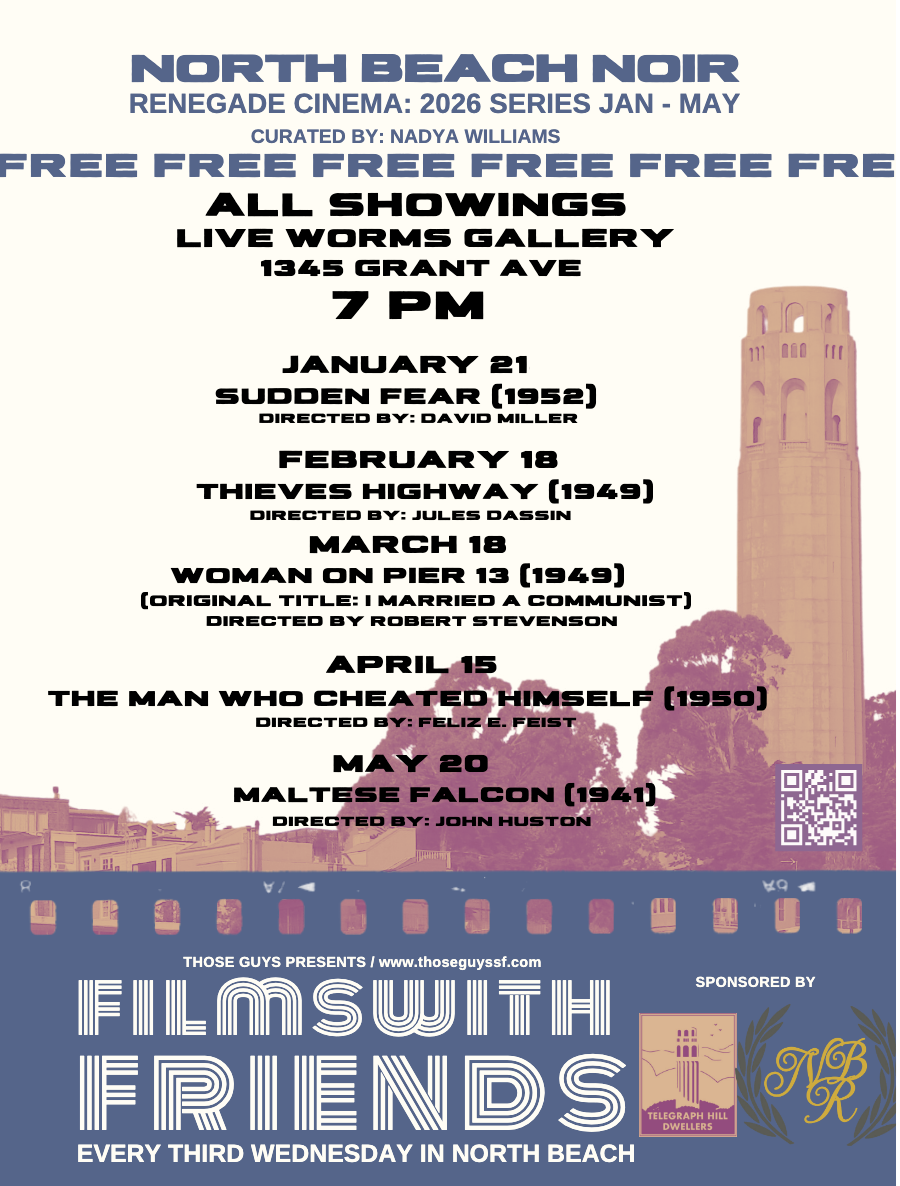 Join North Beach Noir, presented by a group of cinephiles passionate about sharing films that are deeply connected to North Beach, San Francisco, and the city’s rich filmmaking history. Our focus is on films relevant to North Beach, as well as showcasing works from local San Francisco filmmakers. Every third Wednesday from January through May, Professor Seagull's Smartshop hosts free film screenings at its event space, Live Worms Gallery. April's film will be The Man Who Cheated Himself (1950), directed by Feliz E. Feist.